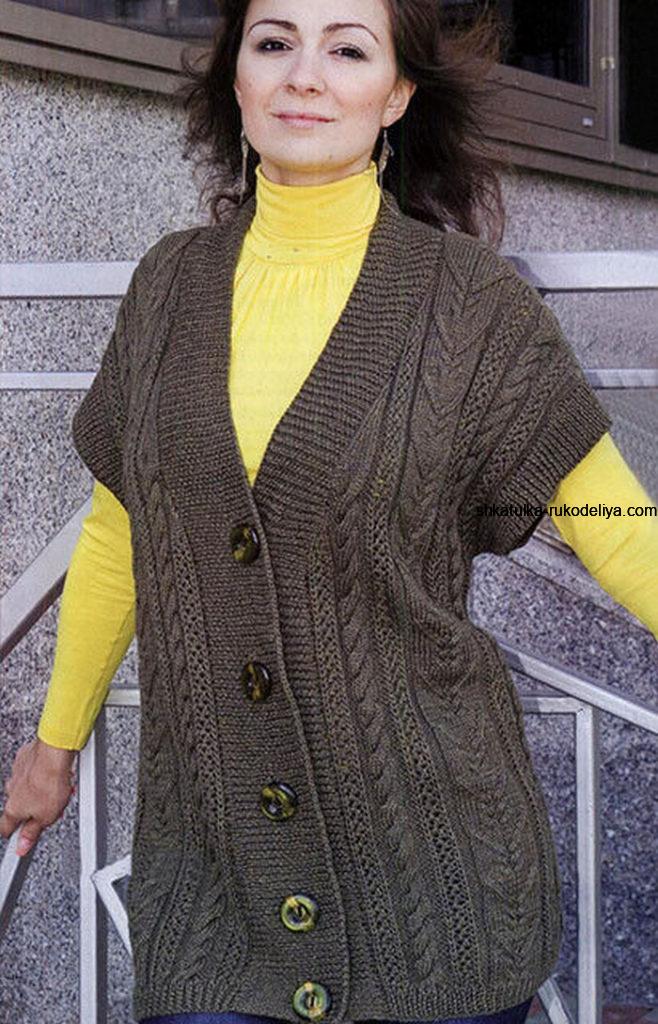 вязание спицами, жилетка, женская, удлиненная, схемы, описание, рельефный узор, теплая