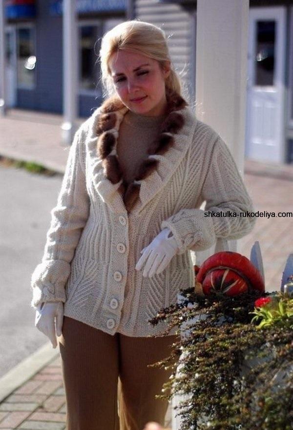 Белый вязаный женский жакет спицами. Жакет рельефным узором с описанием