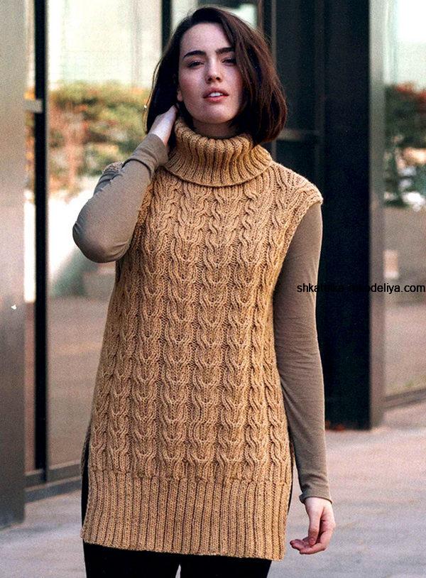Жилет с косами спицами. Теплый женский жилет с большим воротником