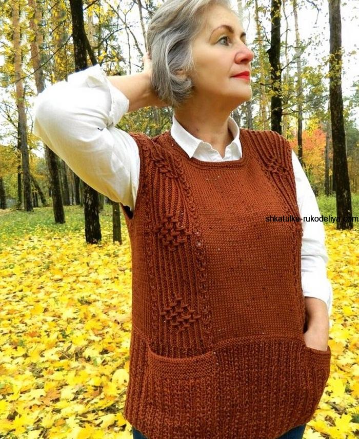 Жилет с пайетками спицами. Вязаный жилет спицами для полных женщин