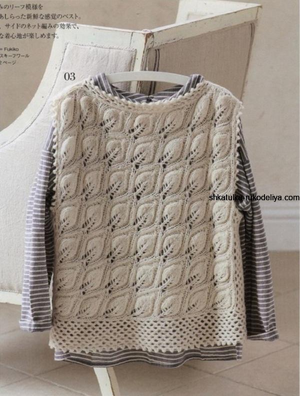 Жилет вязаный от угла узором листья спицами. Японская модель жилета вязаная спицами